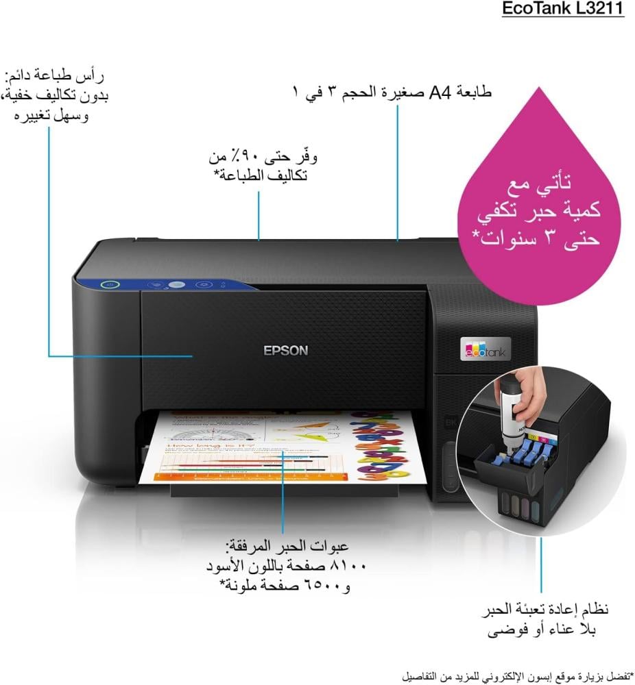 اسم المنتج: طابعة حبر منزلية ايكو تانك L3211 من ابسون، ورق مقاس ايه 4، ملونة، طابعة، لون اسود، حجم صغير، حقن للحبر