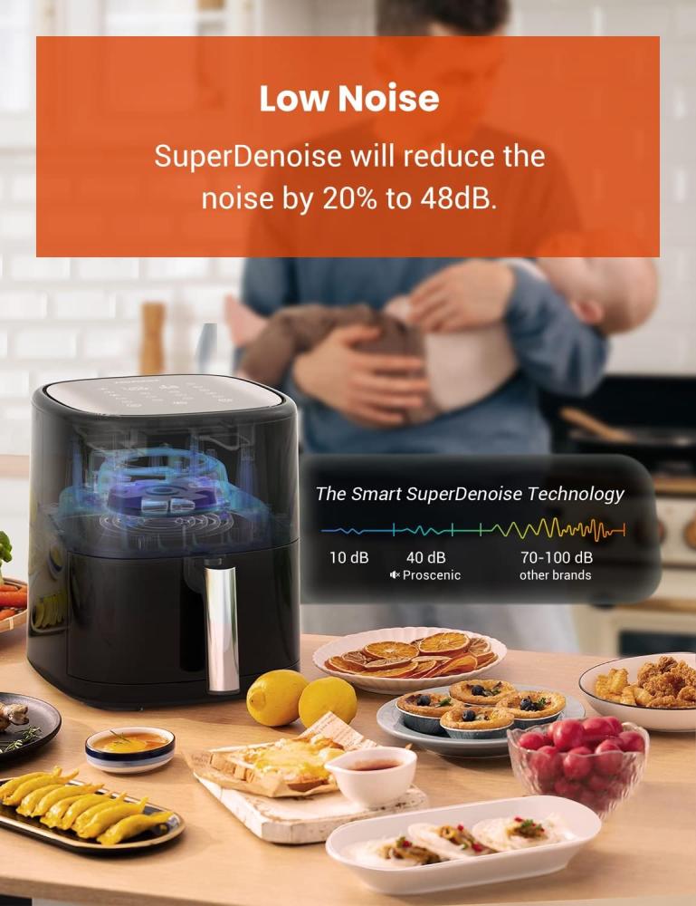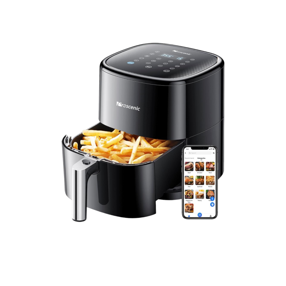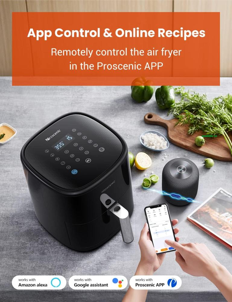 - [التحكم في التطبيق والوصفات عبر الإنترنت]: باستخدام تطبيق بروسينك يمكنك بسهولة التحكم في المقلاة الهوائية وجدولة ومراقبة عملية الطبخ؛ يمكنك أيضًا إنشاء ومشاركة وصفاتك الخاصة على التطبيق.