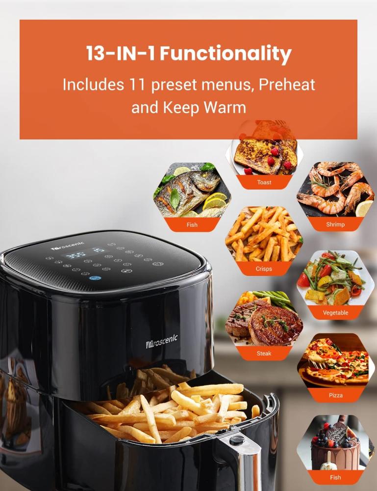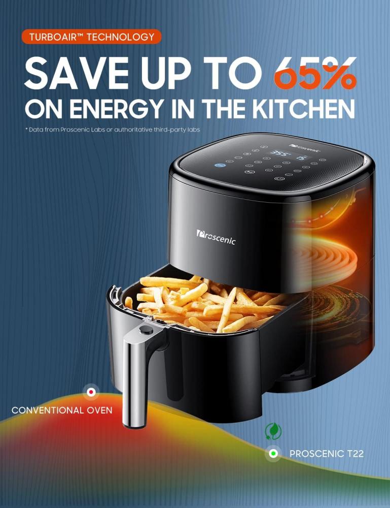 - [تقنية تيربو اير] بمساعدة تقنية تيربو اير التي تعتبر أكثر فعالية 7 مرات من تقنية دوران الهواء العادية، يقلل بروسينك T22 من 90% من الدهون الموجودة في الأطعمة. توفر المقلاة الهوائية دوران الهواء بزاوية 360 درجة حيث يعمل على تسخين الطعام بالتساوي، مما يزيد من كفاءة الطبخ بنسبة 30٪ مع الاحتفاظ بالعناصر الغذائية جيدًا. بعد ذلك، يتم إعطاء الأطعمة لونًا بنيًا هشًا، مما يجعلها تبدو شهية.