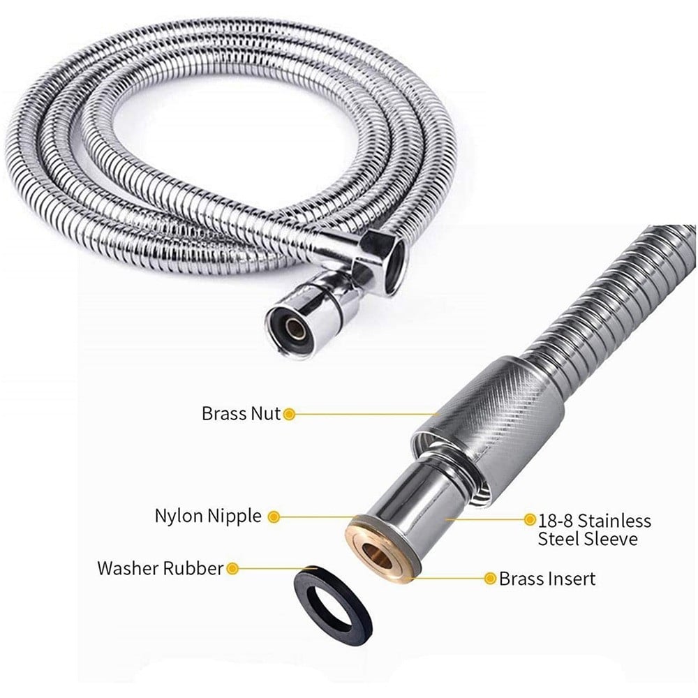 - الجزء الخارجي من الستانلس ستيل: الجزء الخارجي من خرطوم دش الاستحمام هذا مصنوع من الستانلس ستيل 304 لضمان عمر افتراضي طويل ومضاد للانفجار. طلاء من الكروم على سطح خرطوم دش الاستحمام يوفر مظهراً أنيقاً ومقاوَمة للتآكل.