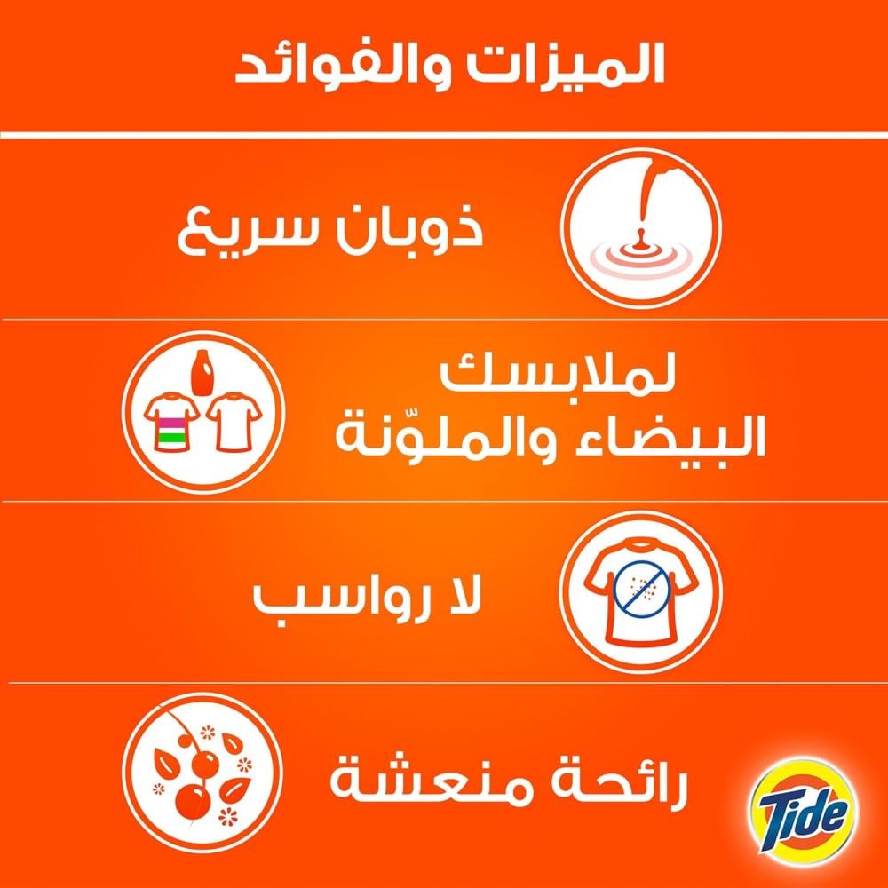 يعد مسحوق الجل تايد للملابس الملونة والبيضاء للغسالات الأوتوماتيكية حلًا عمليًا لجميع متطلبات الغسيل. يحافظ على مظهر ملابسك كالجديدة والمشرقة بفضل التركيبة المتطورة التي تزيل البقع ولا تؤثر على إشراقة الملابس. يسهل ذوبانه ويحتوي على جميع المكونات القوية للتنظيف بدون مجهود. يذوب السائل بشكلٍ أفضل ولا يترك أي رواسب. صُمم خصيصًا ليكون مناسبًا للغسيل اليدوي أو للغسالات الأوتوماتيكية. يعد هذا الجل القوي فعالًا في توفر غسيل وتنظيف سريع للغاية. يذوب شكله السائل بشكل أفضل ويمنحكِ نتائج أروع، بفضل الهيئة السائلة، يذوب هذا الجل بشكلٍ أفضل، وهو معزز بمكونات قوية تساعد في التخلص السريع من البقع. يتغلغل بفعالية في الأنسجة ويتخلص من أصعب البقع وأعندها. يجعل ملابسك أكثر إشراقًا وبرائحة جميلة، لا تؤذي تقنيته الذكية إشراقة الملابس، ويوفر تنظيفًا بدون أي بقع. يعد إضافة رائعة لغرفة غسيلك للحفاظ على ملابسك نظيفة وجديدة وبرائحة رائعة.