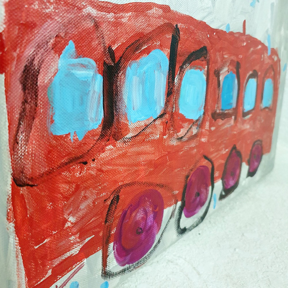 الاصلية لوحة فنية من احمد بعمر 6 سنوات : تحت المطر - اكريلك 40×50 سم Little Artist - Original Acrylic Painting : Rain Red Bus
