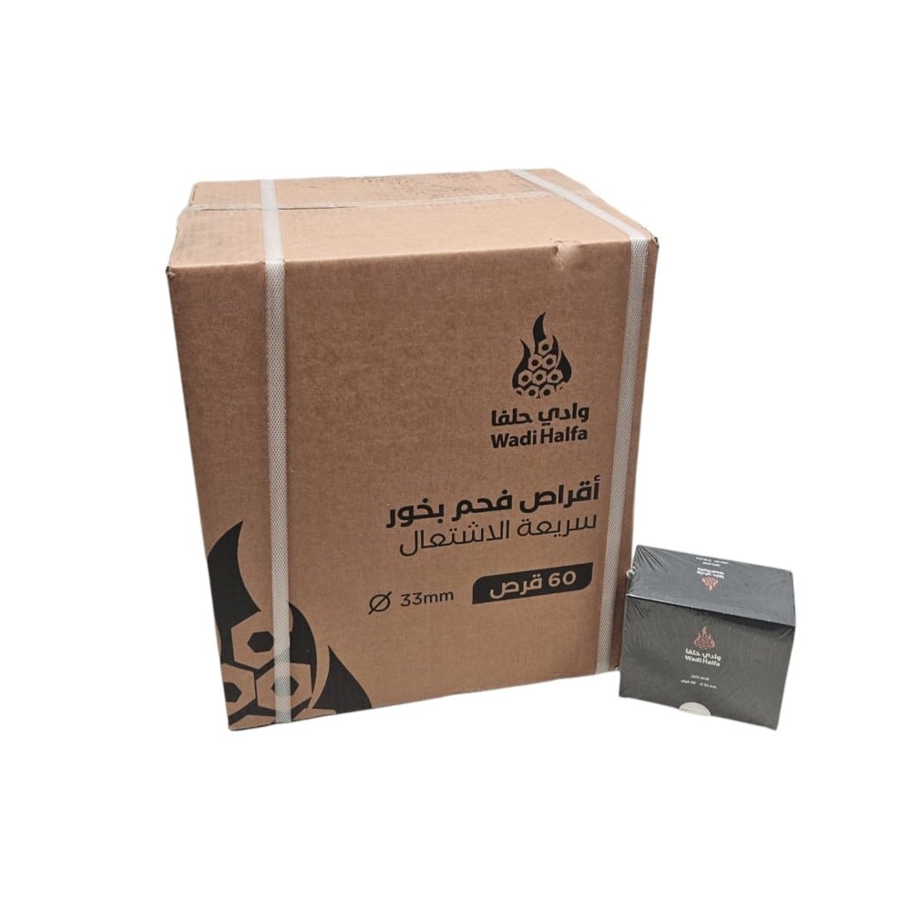 وادي حلفا | فحم بخور اسود دائري | سريع الاشتعال | 33 مم | علبة | 60 حبة | كرتون | 30 علبة